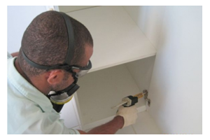 APLICAÇÃO DE GEL - Essa técnica é exclusiva da formulação de inseticida em GEL. O gel pode ser aplicado através de uma pistola aplicadora cuja regulagem é feira para que o gel saia em forma de gotas. Alguns inseticidas nessa formulação é envasado em seringas com a mesma finalidade de aplicação. Os inseticidas formulados em GEL podem são distintos ou seja existem o gel para controle de baratas e o gel para o controle de formigas. Ambos insetos devem ingerir o gel que é uma isca ou seja uma alimento que causará a morte desses, sendo que as baratas morrem individualmente e as formigas carregam o gel para os ninhos que será compartilhado com toda a colônia pois são insetos sociais.